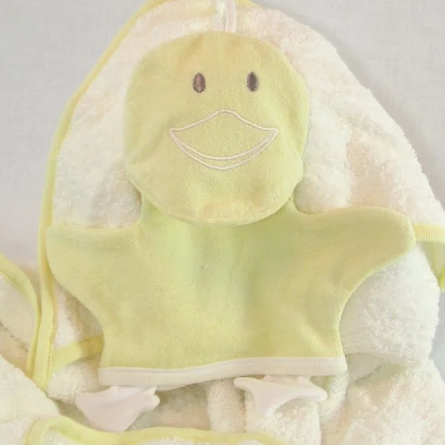 Make bath time fun with this snuggly hooded towel and washcloth set from Under the Nile. Made of organically grown Egyptian cotton and dyed with metal-free colors containing no harmful chemicals. Soft terry towel with green Frog or yellow Duck bath mitt.