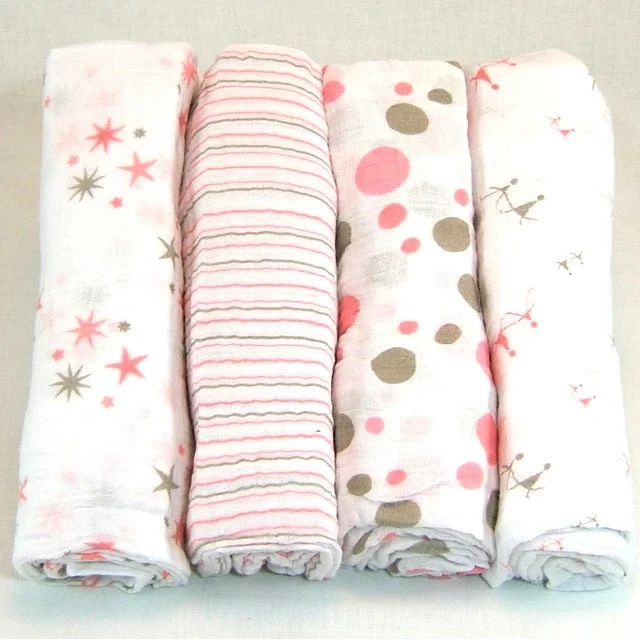 For countless generations, mothers have swaddled and cared for their children with natural muslin. You can continue this tradition with the softest swaddles and fashion-forward prints that say as much about your style as they do about practices that bind mothers together around the world. Pack of four 47" x 47" pre-washed 100% cotton muslin swaddling wraps in White with pink and green or White with blue print.