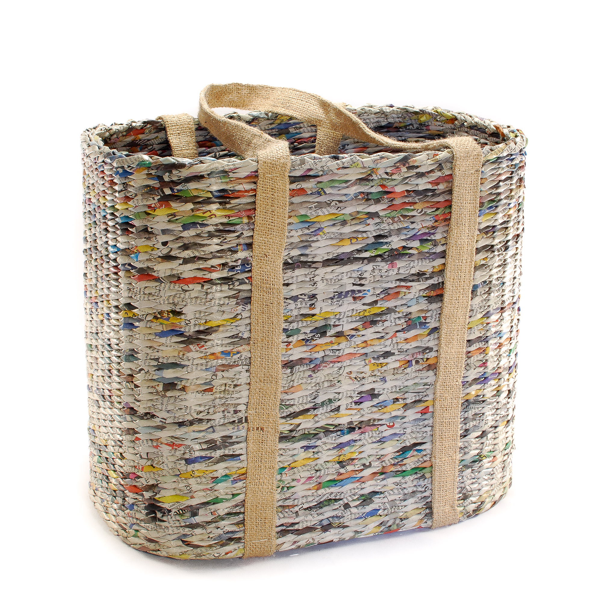It's so in fashion these days to reuse our planet's resources and magazines have found new life in this sturdy, sizable bag. Woven of colorful twisted paper with natural burlap straps, you can use it as a shopping bag or for storage.