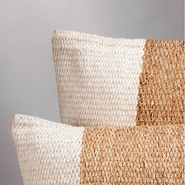 Twisted cotton stripes woven with natural water hyacinth fiber to form stripes of off-white and natural. White cotton canvas backing with 95/5 down insert. 3 sizes available.