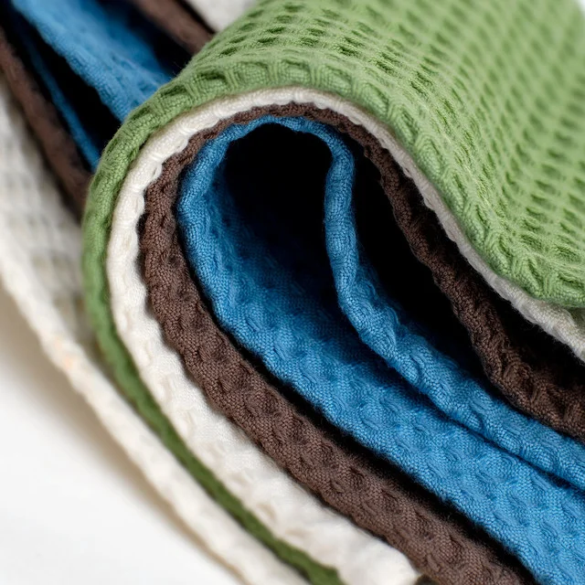 These waffle weave organic dish towels are made of 70% bamboo and 30% organic cotton. They are absorbent and quick-drying, durable and soft. In four natural colors.
